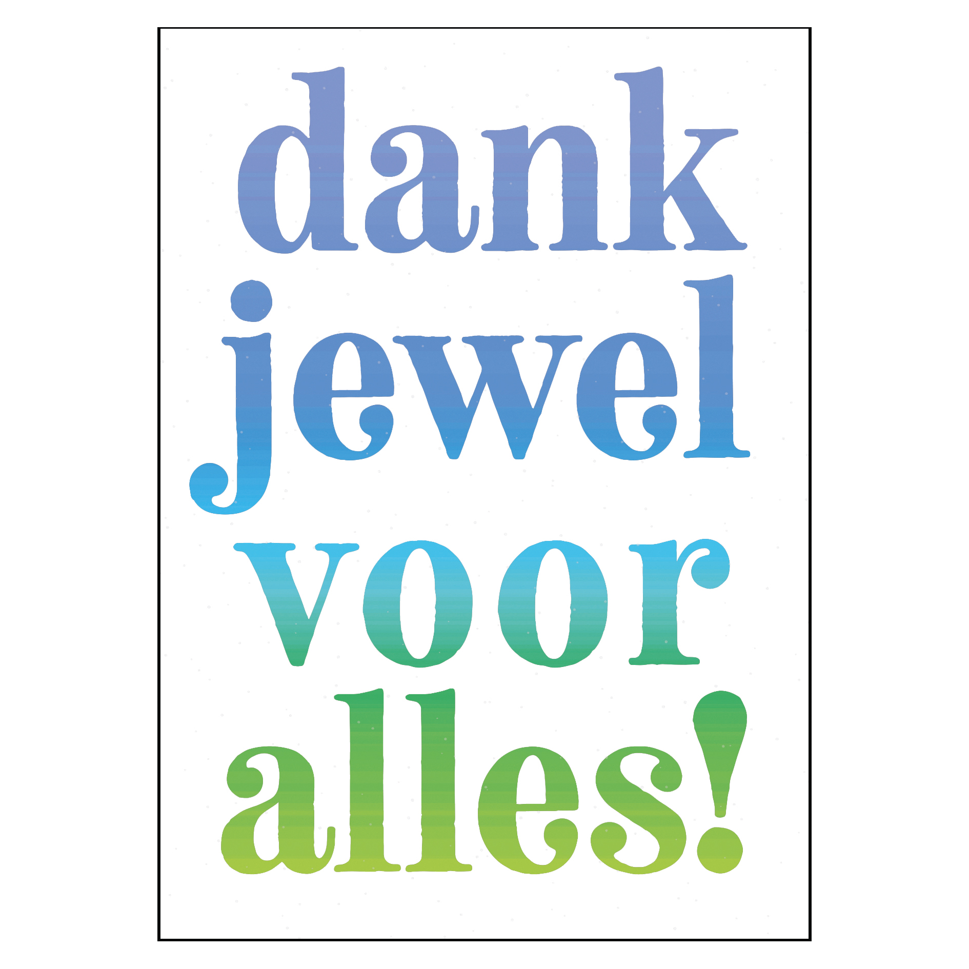 Origineel wenskaart om iemand mee te bedanken. Uitgevoerd in de kleuren blauw en groen. Stuur deze bedankkaart na een etentje, aan je collega of aan de juf of meester als afsluiting voor het afgelopen schooljaar. Door het versturen van een bedankkaartje geef je iemand persoonlijke aandacht, het is een cadeautje in de brievenbus!