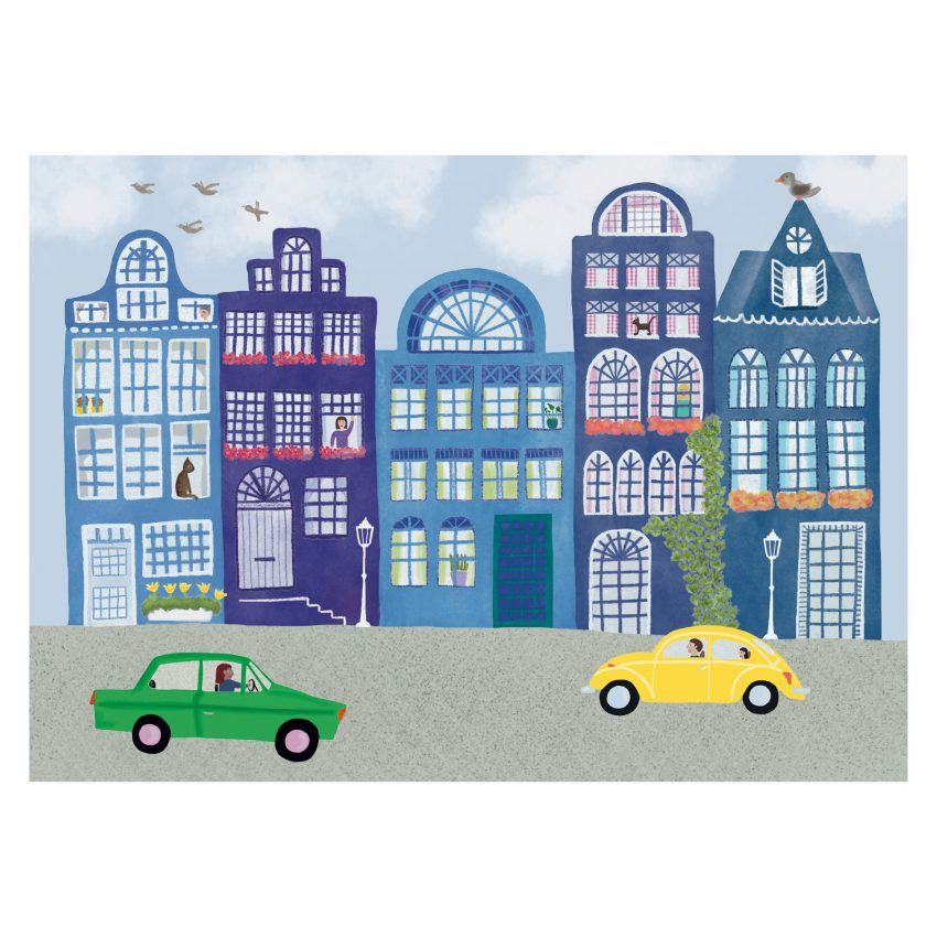 Op deze huis-geïllustreerde wenskaart zie je onder andere blauwe huisjes, vogels, katten en twee auto’s (een kever en een DAF’je). Deze kaart zou je kunnen gebruiken als verhuiskaart, of voor mensen die gaan samenwonen, of als geslaagdkaart voor het rijbewijs (vanwege de autootjes!)