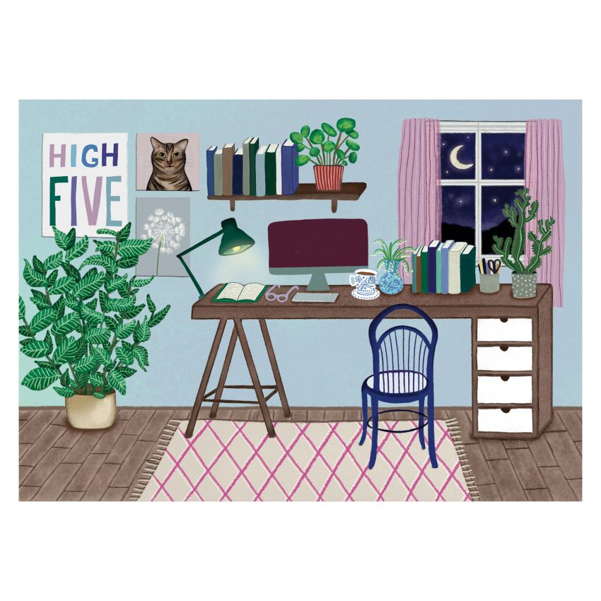 Op deze huis-geïllustreerde wenskaart zie je een bureautje, veel plantjes en boeken. Op het bureau staat een computer. Aan de muur posters van een kat, bloem, en eentje met de tekst high five. Bestel deze kaart en stuur hem naar iemand die een nieuwe baan heeft, of wanneer iemand voor een examen is geslaagd. Door het raam zie je een maan en sterren, wat misschien kan verwijzen naar vele nachten doorhalen 🙂