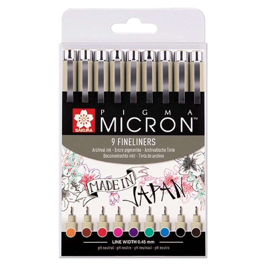 Fijne set van 9 fineliners van Sakura Pigma Micron. De dikte van deze pennen is 0,45 mm. Kleuren in deze set zijn oranje, bruin, rood, roze, paars, groen, blauw, zwart en sepia. De inkt loopt niet uit, vloeit niet uit en drukt niet door op de meeste soorten papier. Een ideale set om te beginnen met tekenen met fineliners of zentanglen. Heerlijke, rustgevende activiteiten.