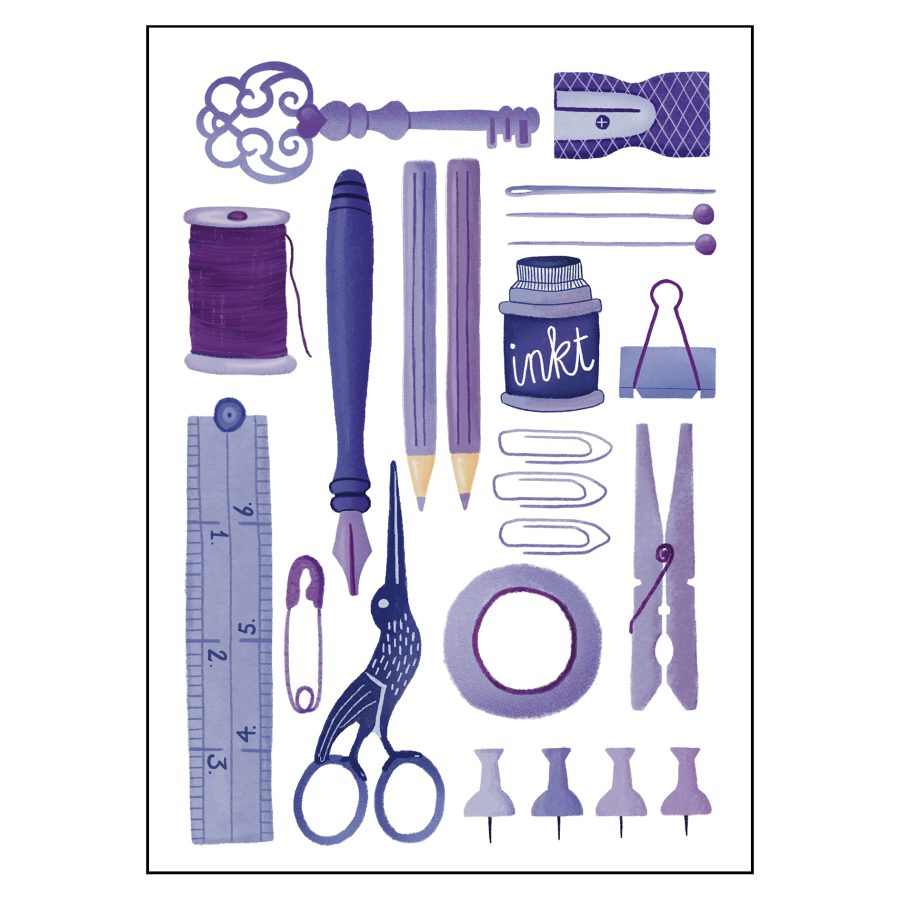 Op deze huis-geïllustreerde flatlay wenskaart zie je vooral knutsel en handwerkspullen. Zoals een kroontjespen, inkt, punaises, punaises, naald en draad, getekend in paarstinten. Deze kaart heeft geen tekst, en is hierdoor voor allerlei gelegenheden te gebruiken. Gebruik hem als verjaardagskaart, of verstuur eens zomaar een kaart, want wat is er leuker dan handgeschreven post!