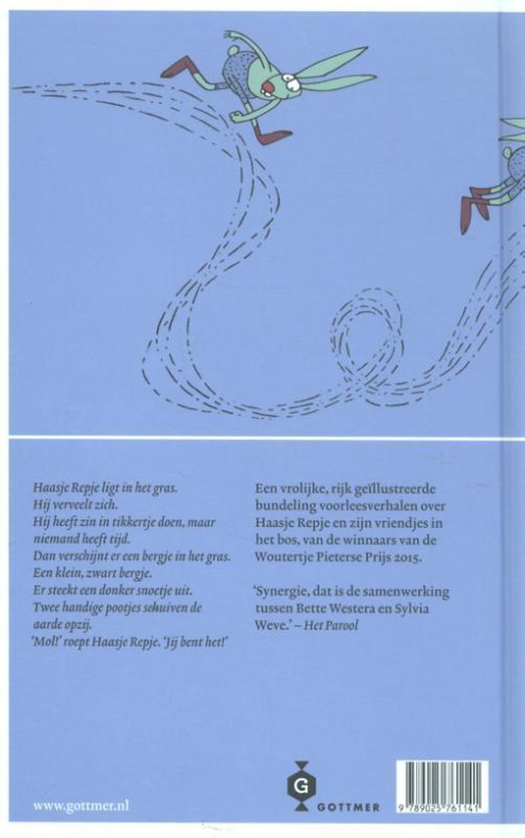 Bette Westera & Sylvia Weve – Haasje Repje is een vrolijke bundeling voorleesverhalen van Bette Westera, die eerder verschenen onder de titel Ra ra, wie ben ik? Deze compleet herziene uitgave werd van nieuwe illustraties voorzien door Gouden Penseelwinnares Sylvia Weve. In 2015 ontving dit duo de Woutertje Pieterse prijs voor hun dichtbundel Doodgewoon.