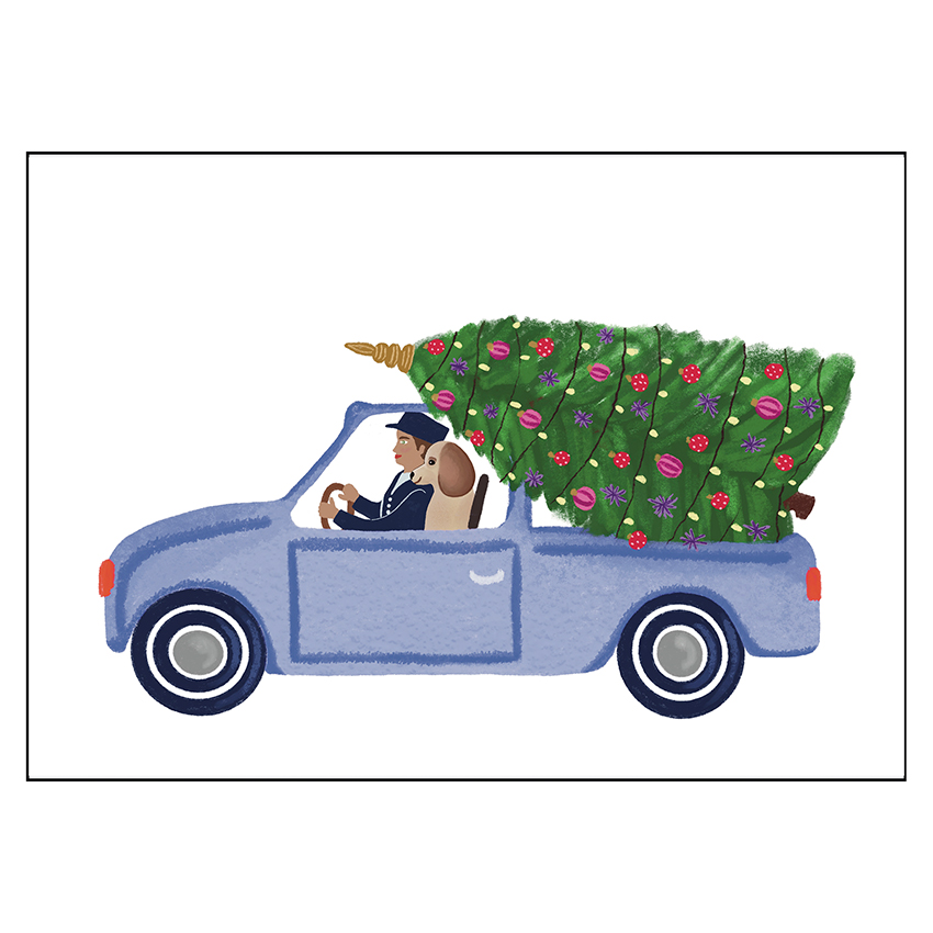 Originele leuke kerstkaart met een blauwe auto, een man, een hond en een versierde kerstboom met lichtjes, kerstballen en een piek bovenop. De illustratie is door onszelf gemaakt, en geprint in onze copyshop in Nijmegen. Binnenin is deze kaart blanco.