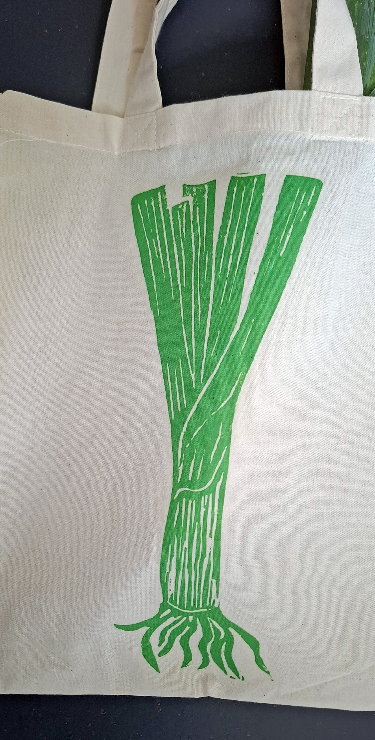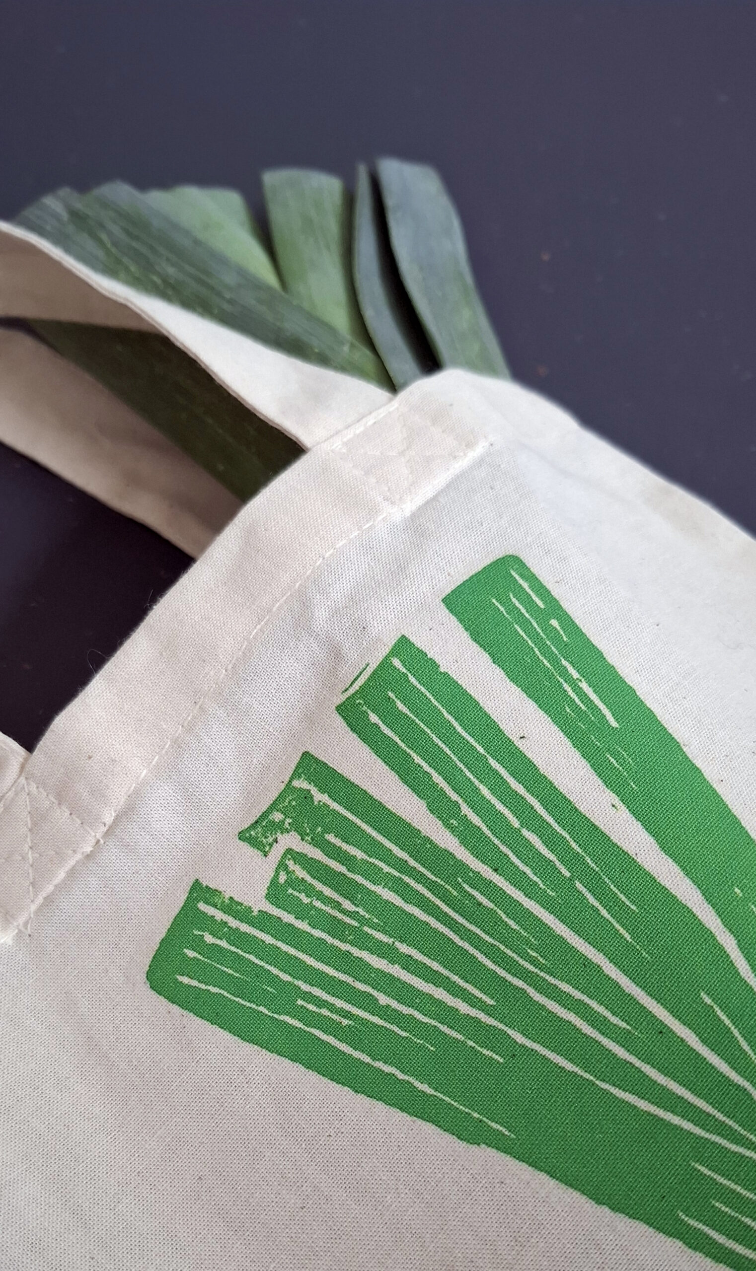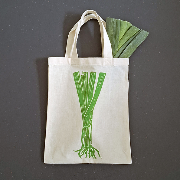 Linnen tasje met een illustratie van prei. De opdruk staat op één kant van de tas.