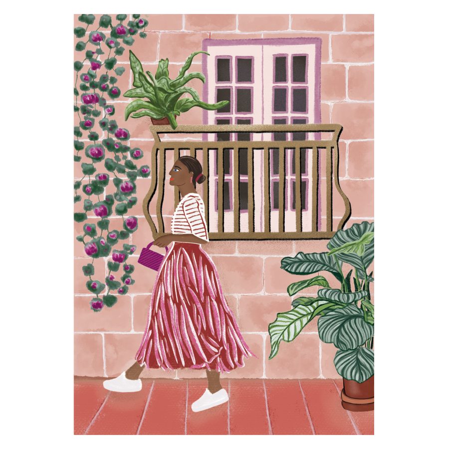 Op deze kaart zie je een vrouw in een zomerse outfit lopen op (een Italiaanse?) straat, ook staan er een balkon en planten op. Deze illustratie op deze wenskaart is door onszelf getekend en geprint. en heeft geen tekst. Hierdoor is deze wenskaart voor allerlei gelegenheden te gebruiken, zoals voor je verjaardag.