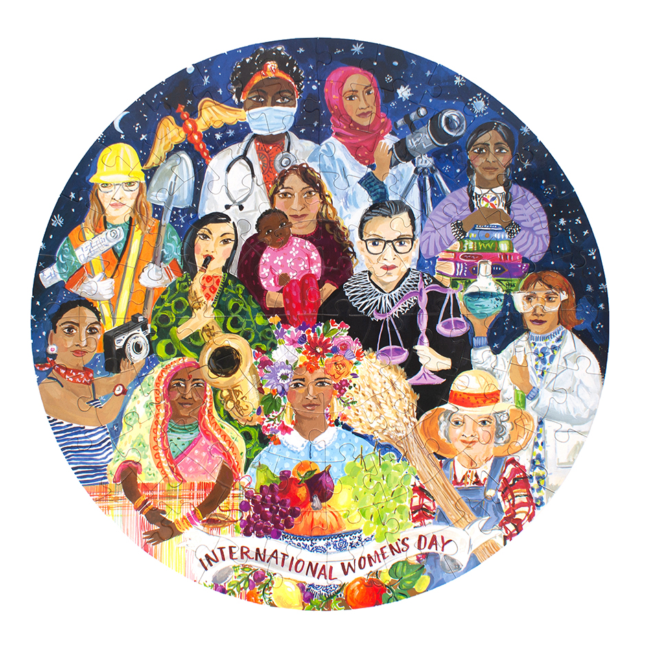 Puzzel International Womens Day, met een mooie, kleurrijke illustratie gemaakt door Jennifer Orkin Lewis. Op de illustratie zijn verschillende vrouwen, die verschillende beroepen uitoefenen te zien. Internationale Vrouwendag wordt elk jaar wereldwijd gevierd op 8 maart. Deze puzzel is rond van vorm, met een diameter van 58,4 centimeter, en heeft 100 stukjes.
