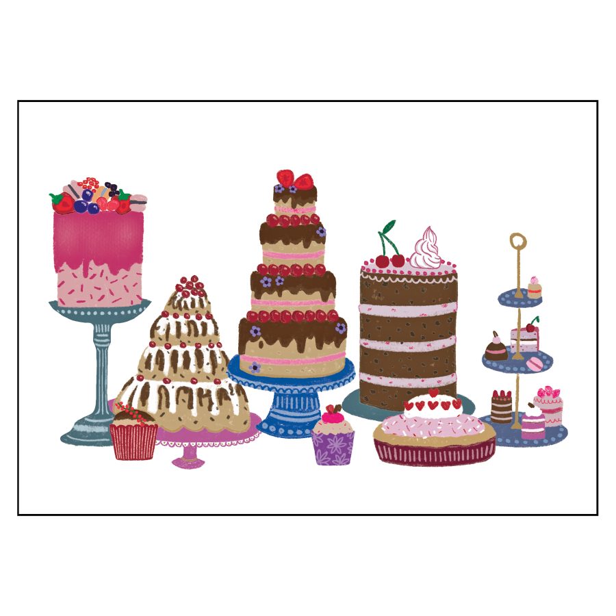Wenskaart voor voor een feestelijke gebeurtenis! Deze dubbele kaart met heel veel taartjes, cupcakes en petit fourtjes is door onszelf geïllustreerd en huisgeprint. Leuk om te versturen voor bijvoorbeeld een verjaardag! Behalve als verjaardagskaart, ook geschikt voor een huwelijk of om zomaar te versturen. Want wat is er nou leuker dan het sturen en ontvangen van post. Zeker als er lekkere taarten op staan!
