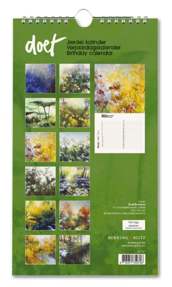 Vergeet nooit meer een verjaardag of een ander belangrijk moment met deze leuke verjaardagskalender. Bij elke maand een van de prachtige werken van Doet Boersma. Deze kalender is ook een mooi verjaardagscadeau, voor mannen en vrouwen . We pakken het graag mooi voor je in.