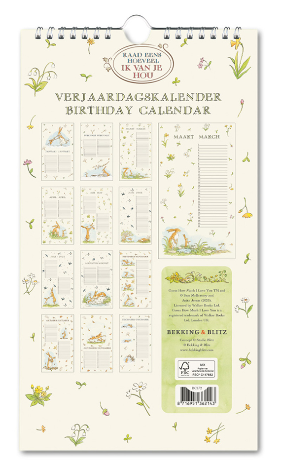 Vergeet nooit meer een verjaardag of een ander belangrijk moment met deze verjaardagskalender van raad eens hoeveel ik van je hou. Bij elke maand een mooie illustratie uit het geliefde boek van Anita Jeram. Deze kalender is ook een mooi verjaardagscadeau voor kinderen en voor volwassenen, we pakken de kalender graag mooi voor je in.