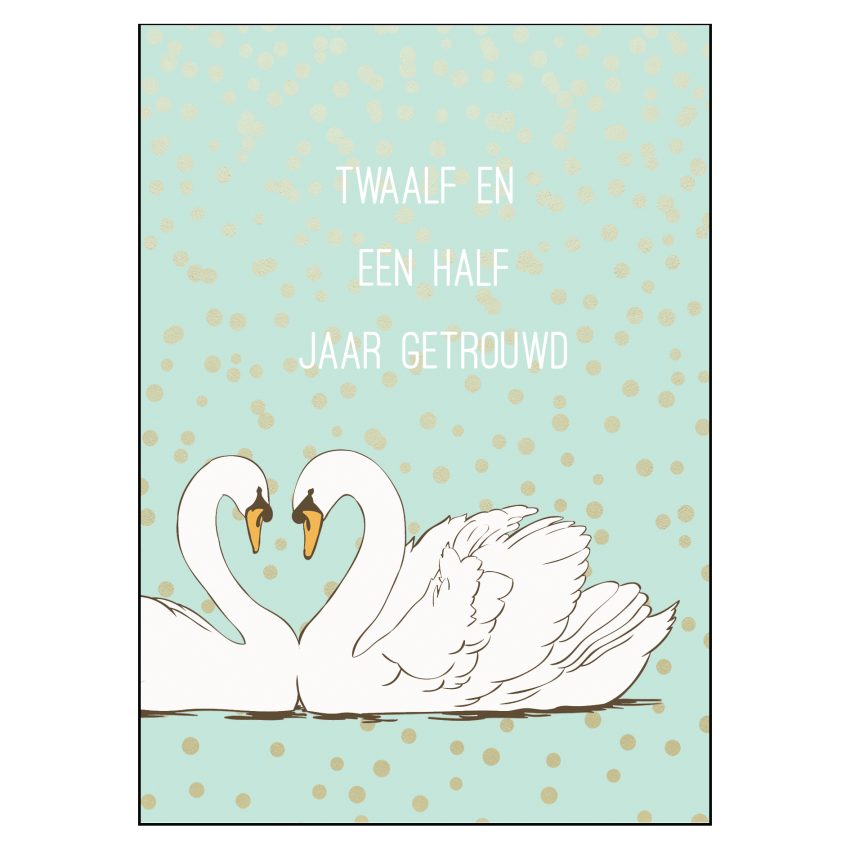Originele wenskaart voor een 12,5 jarig huwelijk met twee zwanen. Feliciteer het gelukkige koppel met het jubileum van hun bruiloft met dit leuke en unieke kaartje, en wens ze nog vele gelukkige jaren samen toe!