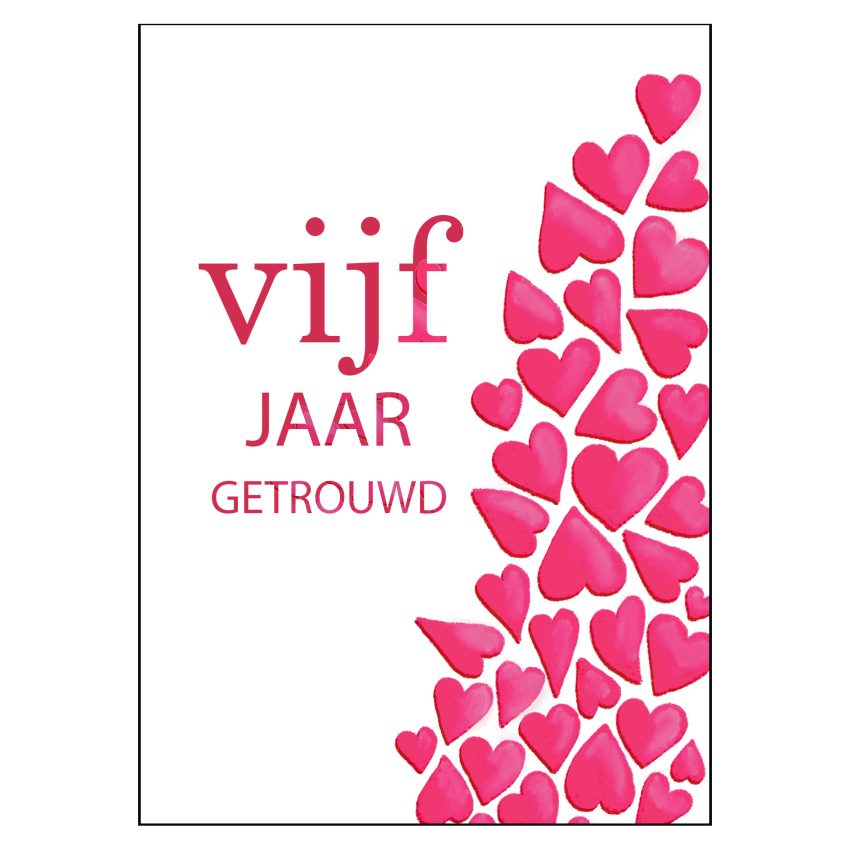 Origineel kaartje voor het 5 jarig jubileum van een huwelijk met heel veel hartjes (ook op de achterkant). Feliciteer het gelukkige koppel met dit leuke kaartje en wens ze nog vele gelukkige jaren samen toe en veel liefde! De kaart is ontworpen in onze eigen ontwerpstudio.