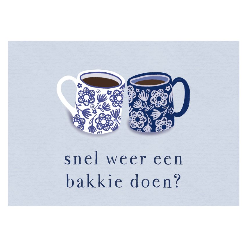 Blauwe, dubbele kaart met hierop twee mokken met koffie, de mokjes zijn versierd met bloemen. Hier onder staat de tekst: snel weer een bakkie doen? Leuke kaart om te gebruiken om iemand uit te nodigen voor een kopje koffie thuis, of buiten de deur. Deze wenskaart is blanco van binnen.