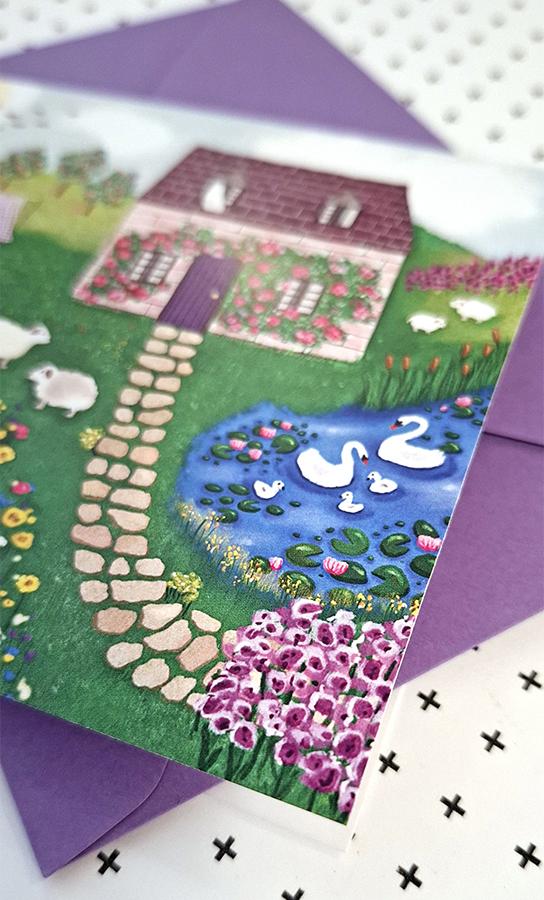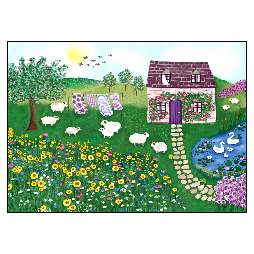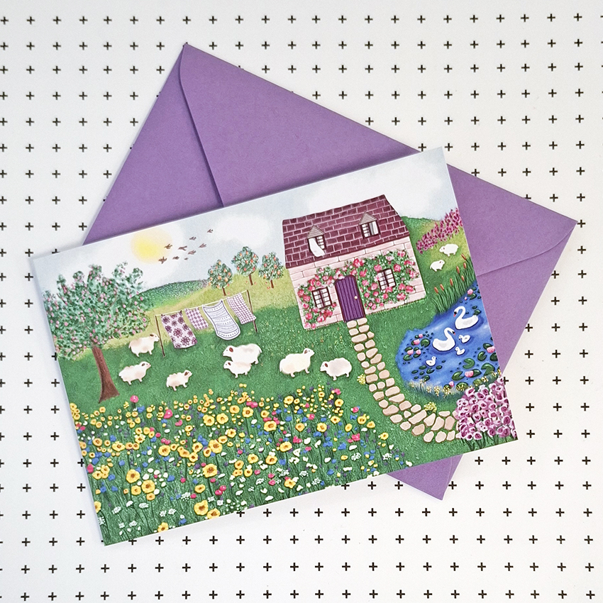 Huisgemaakte, kleurrijke kaart met een illustratie van een huisje in een weiland, met bloemen, een waslijn met frisse, schone was die hangt te drogen, schaapjes, en een vijver met zwanen.