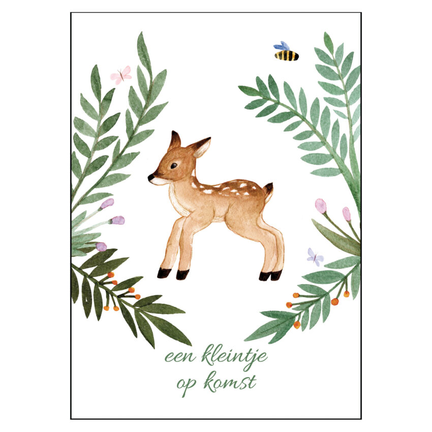 Wenskaart kleintje op komst met een lief hertje. Er is een kindje op komst, dat is voor de toekomstige ouders iets bijzonders. Wil jij de ouders to be feliciteren met de zwangerschap? Stuur dan een leuk kaartje. Deze met een lief klein hert, samen met takjes, een bijtje, vlindertjes en daaronder de tekst: ‘een kleintje op komst’.