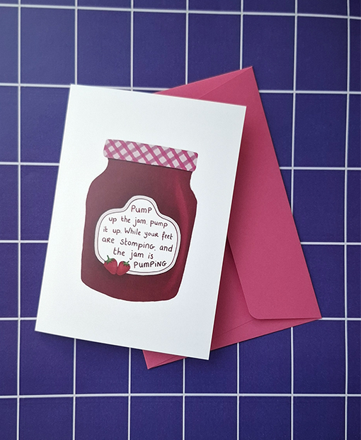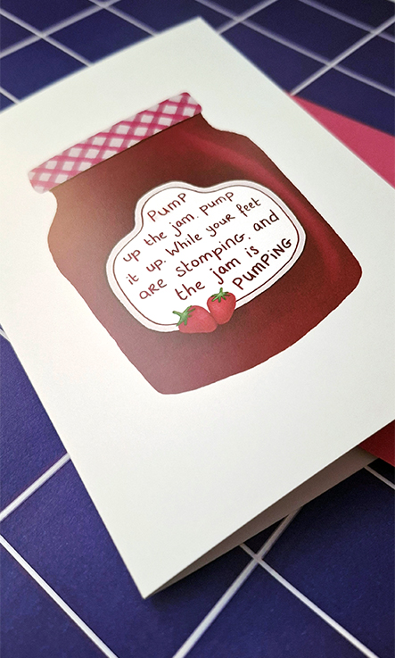 Deze handgemaakte wenskaart is voorzien van onze eigen illustratie van een potje aardbeienjam. Het roze-wit geruite dekseltje en het etiket met een knipoog naar de eighties hit Pump the Jam geven de kaart een vrolijke, licht nostalgische uitstraling. Perfect om iemand te verrassen met een originele en humorvolle kaart.